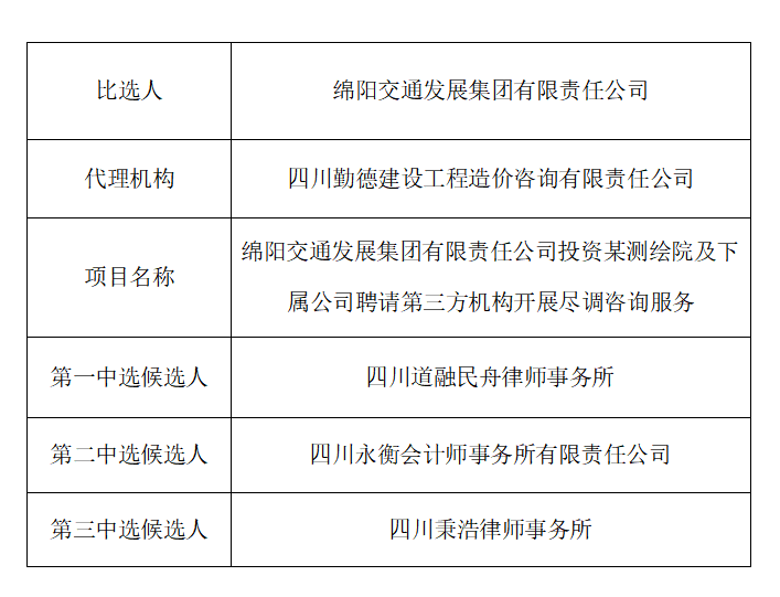 綿陽交通發(fā)展集團有限責任公司投資某測繪院及下屬公司聘請第三方機構開展盡調咨詢服務中選候選人公示