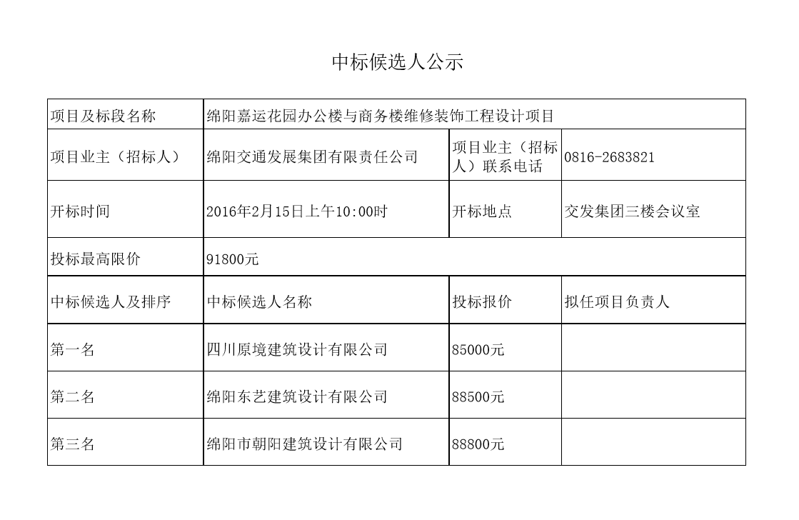 綿陽嘉運花園辦公樓與商務樓維修裝飾工程設計項目中標候選人公示