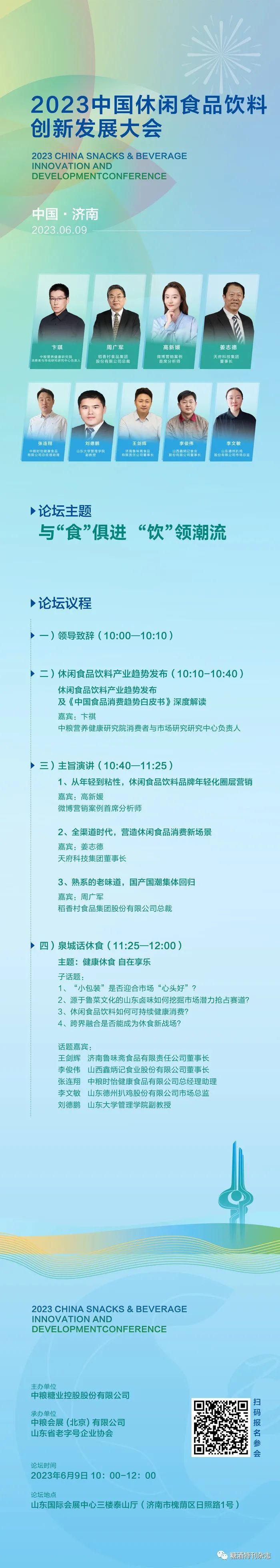 6月9日-11日,2023中國休閑食品飲料博覽會(簡稱“休食展”)將在濟南市山東國際會展中心舉辦。作為重點配套活動之一的2023中國休閑食品飲料創(chuàng)新發(fā)展大會也將于6月9日10:00-12:00在山東國際會展中心三樓泰山廳舉行。如果你是休閑食品飲料行業(yè)從業(yè)者,在這場大會上,你可以獲得“為什么做”、“做什么”、“怎么做”的N個啟發(fā)。