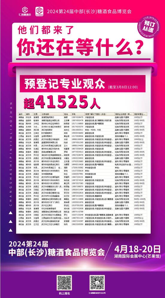 截止4月7日中午12:00,線上報(bào)名參加2024中部(長(zhǎng)沙)糖酒會(huì)的專業(yè)觀眾數(shù)量已突破