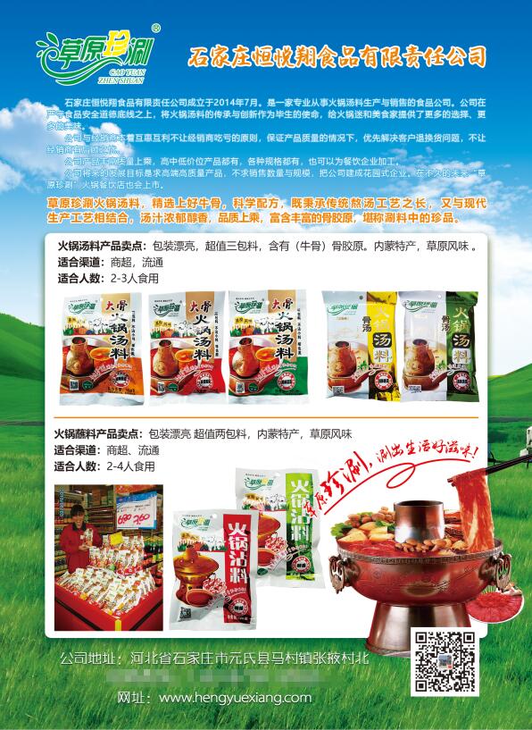 草原珍涮火鍋湯料,精選上好牛骨,科學(xué)配方,即秉承傳統(tǒng)熬湯工藝之長,又與現(xiàn)代生產(chǎn)工藝相結(jié)合,湯汁濃郁醇香,品質(zhì)上乘,富含豐富的骨膠原,堪稱涮料中的珍品。