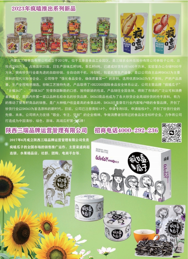 內(nèi)蒙古三瑞食品有限公司成立于2012年,位于五原縣食品工業(yè)園區(qū),是三瑞農(nóng)業(yè)科技股份有限公司參股子公司??偼顿Y2000萬(wàn)元,占地面積25畝,日生產(chǎn)原味瓜籽5噸,香瓜籽8噸,已建成炒貨車間1600平方米,實(shí)驗(yàn)室辦公倉(cāng)儲(chǔ)9000平方米,擁有炒貨行業(yè)最先進(jìn)的自助炒鍋、全自動(dòng)烘干機(jī)、冷卻機(jī)、包裝機(jī)等生產(chǎn)設(shè)備,是以公司自主品種SH363為主要原料的現(xiàn)代化炒貨企業(yè)。 公司恪守“強(qiáng)化食品安全,確保質(zhì)量第一”的原則,選用優(yōu)質(zhì)SH363為生產(chǎn)原料,嚴(yán)把產(chǎn)品質(zhì)量,生產(chǎn)全程精挑細(xì)選,炒制工藝獨(dú)特先進(jìn),產(chǎn)品取得了IOS22000國(guó)際食品安全體系認(rèn)證。公司主營(yíng)品牌“瘋嗑瓜子”“鄉(xiāng)嗑363”、“原味363”憑借香甜酥脆的口感、獨(dú)特新穎的包裝,產(chǎn)品銷往全國(guó)各地,得到了市場(chǎng)的廣泛認(rèn)可和消費(fèi)者的喜愛(ài),是國(guó)內(nèi)外第一家以品種稱命名的炒貨品牌。SH363商品也成為了各大炒貨企業(yè)高端炒貨的搶手原料,有力的推動(dòng)了葵花籽商品的銷售,是廣大種植戶收益最高的食葵品種。SH363已是葵花行業(yè)內(nèi)家喻戶曉的食葵品牌,開(kāi)創(chuàng)了炒貨行業(yè)以SH363為首選原料的新時(shí)代。目前,公司已注冊(cè)商標(biāo)14個(gè),申請(qǐng)專利5項(xiàng),申請(qǐng)版權(quán)4個(gè),開(kāi)創(chuàng)了炒貨行業(yè)的先鋒。未來(lái),公司將大力發(fā)揚(yáng)“敬業(yè)、專注、堅(jiān)韌”的企業(yè)精神,爭(zhēng)做消費(fèi)者信得過(guò)的食品安全標(biāo)桿企業(yè),力爭(zhēng)將公司打造成為中國(guó)清炒、綠色、原味、高端瓜籽第一品牌!