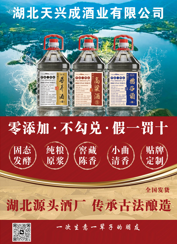 鄂州市汀祖鎮(zhèn)天興成酒廠是湖北鄂東南地區(qū)專業(yè)釀造純糧食酒的廠家,我們酒廠主要生產(chǎn)純谷酒,高粱酒,糯谷酒,五糧酒,包谷酒,苦蕎酒等純糧食酒,小曲清香,傳統(tǒng)工藝,固態(tài)發(fā)酵,日均產(chǎn)酒4000斤,常年儲(chǔ)備基酒500噸以上,5到10年以上的陳年老酒也有接近100噸,全國合作散酒店鋪、小釀酒坊、酒廠等500余家,可以滿足您的各種需求,支持批發(fā)零售,支持區(qū)域代理,支持OEM/ODM等各種合作模式,一件代發(fā),全國發(fā)貨,同等品質(zhì),價(jià)格優(yōu)惠,歡迎有需求的老板與我聯(lián)系,誠交天下酒友。
